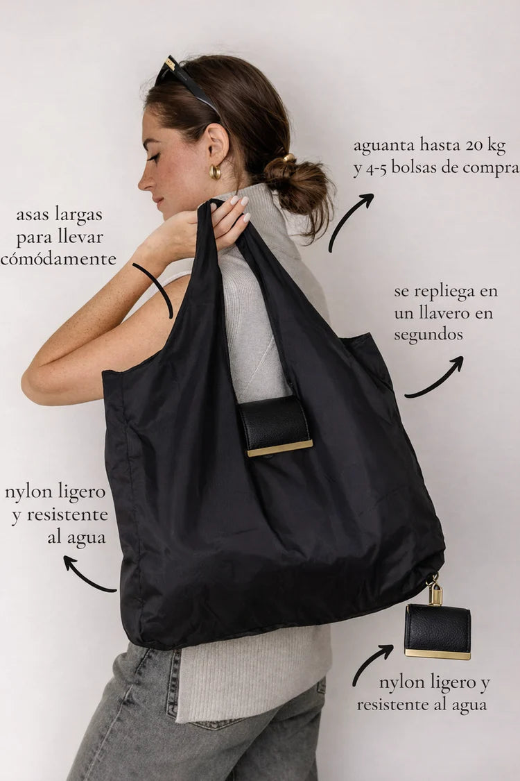 Una bolsa ligera, compacta y elegante pensada para esos momentos en los que necesitas más espacio sin cargar de más. Se pliega fácilmente y siempre está lista cuando la necesitas.